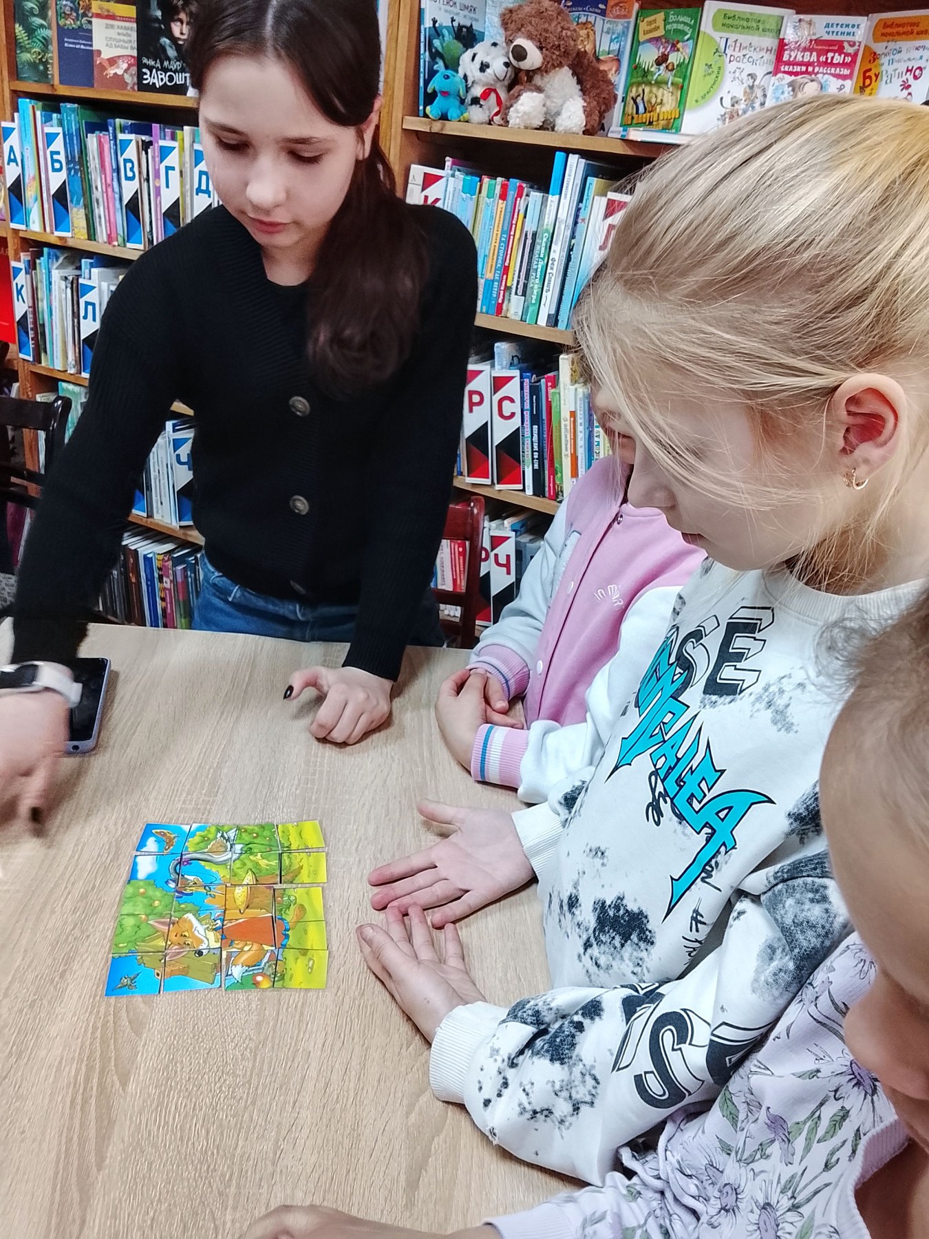 Ребята отвечали на вопросы викторины, складывали сказочные пазлы, провели игру-пантомиму, провели такие игры как: “Предмет из сундука”, “Сказочная математика”, блиц-турнир “Верно или нет”. Библиотекарь ознакомила с детскими книгами сказок. Все получили сладости.
